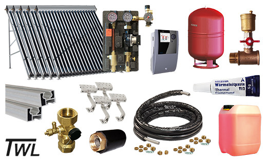 Im Solarpaket sind ein Montage-Set mit Dachhaken und Dachschienen, für den senkrechten Aufbau auf einem Ziegeldach, sowie die Steuerung, Solarstation und sonstige Bauteile enthalten. Die Bauteile im TWL-Solarpaket sind genau aufeinander abgestimmt und gewähren einen einwandfreien Betrieb. Mit dem Kollektoranschluss-Set lassen sich problemlos die Dachdurchführung, der Anschluss der Solarstation zum Pufferspeicher und zum Ausdehnungsgefäß erstellen.